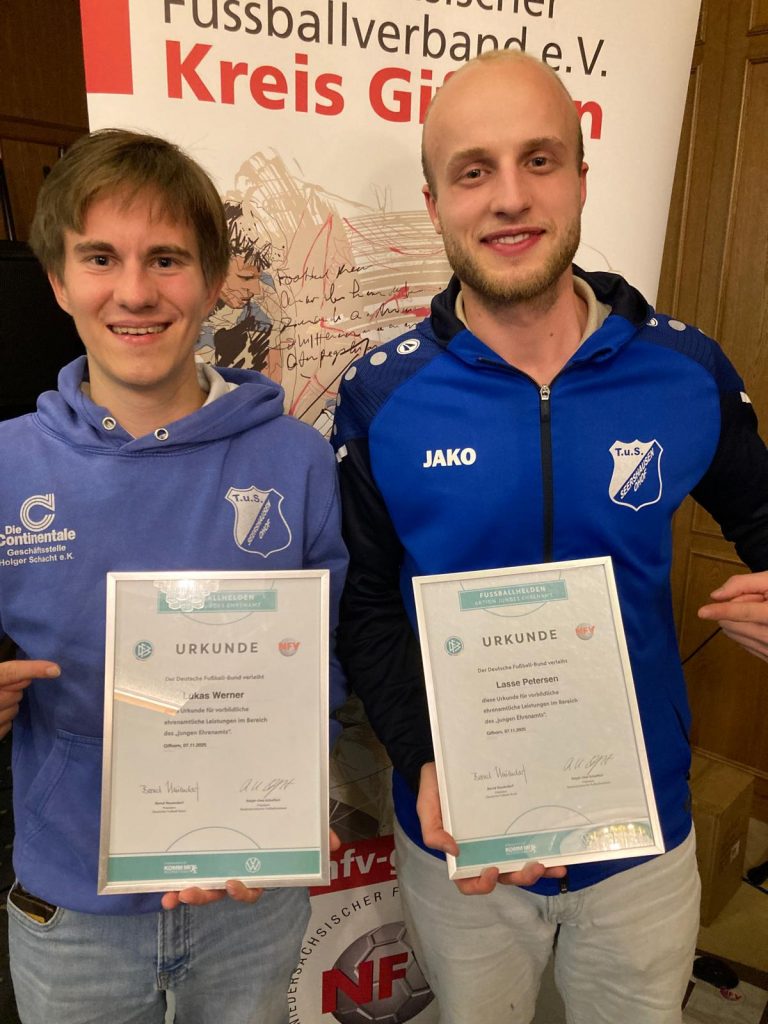 Unser Spartenleiter Lukas Werner und stellvertretender Jugendleiter Lasse Petersen wurden vom NFV Gifhorn im Rahmen der Aktion „Fußballhelden – Junges Ehrenamt“ für ihren starken Einsatz ausgezeichnet. 👏